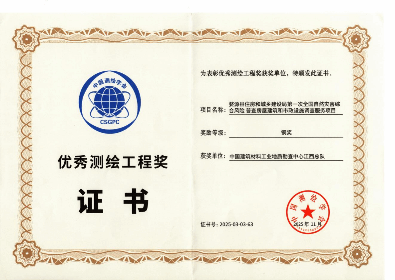 根据《国家科学技术奖励条例》和《中国测绘学会科学技术奖励办法》等规定,2025年10月17日,中国测绘学会开展了2025年全国优秀测绘工程奖评选工作,我队测绘地理信息院承担完成的“婺源县住房和城乡建设局第一次全国自然灾害综合风险普查房屋建筑和市政设施调查服务”项目,荣获中国测绘学会2025年度优秀测绘工程铜奖。